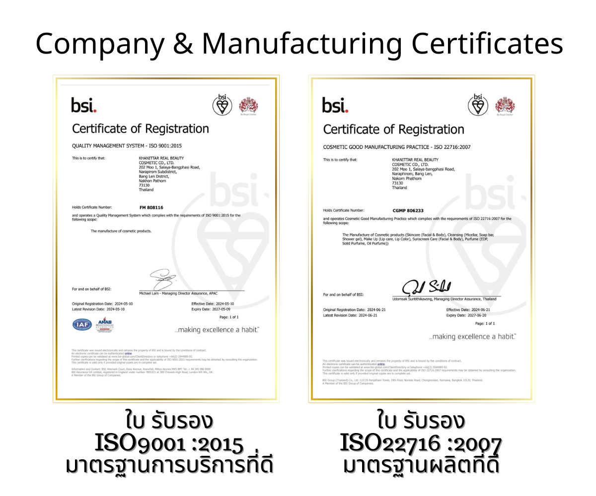 เคคอสเม็กซ์ ภายใต้การดูแลของ บริษัท ขนิษฐา เรียลบิวตี้ จำกัด โรงงานผลิตบลัชออน ภายใต้มาตรฐานสากล ISO 9001:2015 และ ISO 22716:2017 หรือที่เรียกกันว่า ASEAN Cosmetic GMP มาตรฐานการผลิตบลัชออน ที่รับรองโดยกระทรวงสาธารณสุข ซึ่งสามารถส่งออกบลัชออน ไปยังกลุ่มชาติอาเซียน 10 ประเทศ อีกหนึ่งมาตรฐานสำคัญในอุตสาหกรรมบลัชออน ที่สหภาพยุโรป (EU) ให้การรับรอง