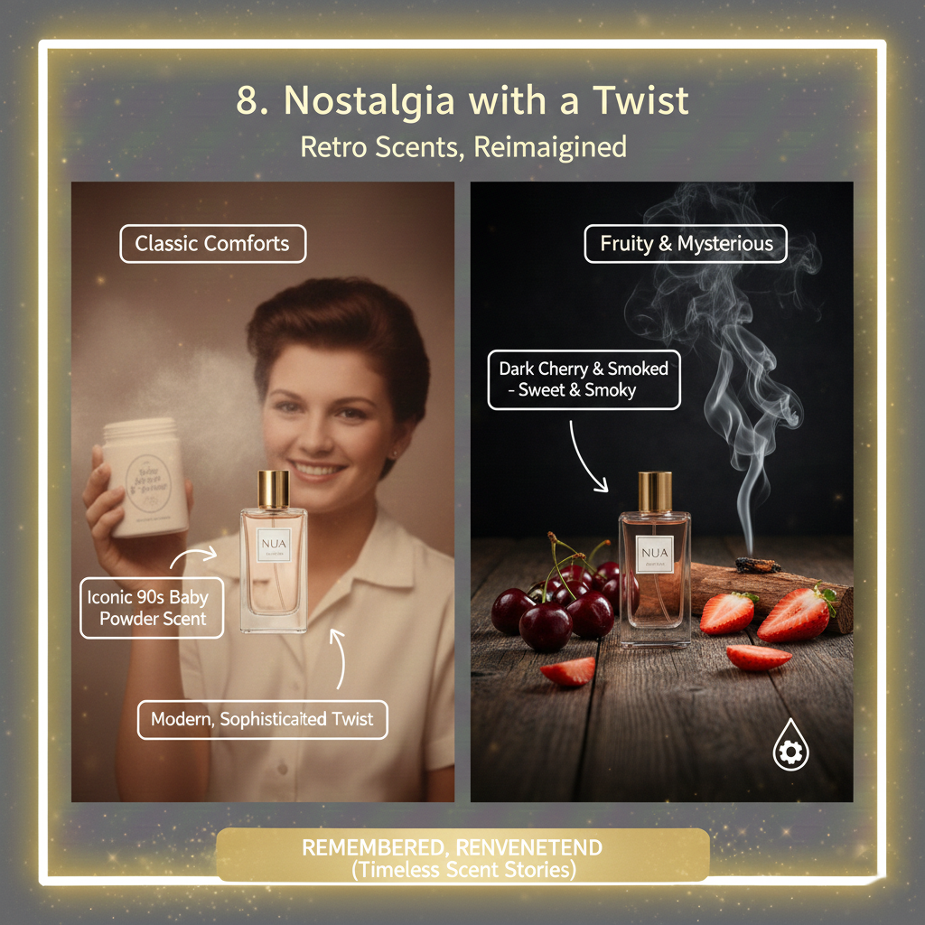 การนำกลิ่นยอดฮิตในยุค 90s หรือ 2000s กลับมาตีความใหม่ (Retro Revival) เช่น กลิ่นแป้งเด็กที่ทำให้ดูโมเดิร์นขึ้น หรือกลิ่นผลไม้ (Fruity) อย่างเชอร์รี่และสตรอว์เบอร์รี่ที่ผสมกับกลิ่นควันไม้ให้ดูลึกลับน่าค้นหา