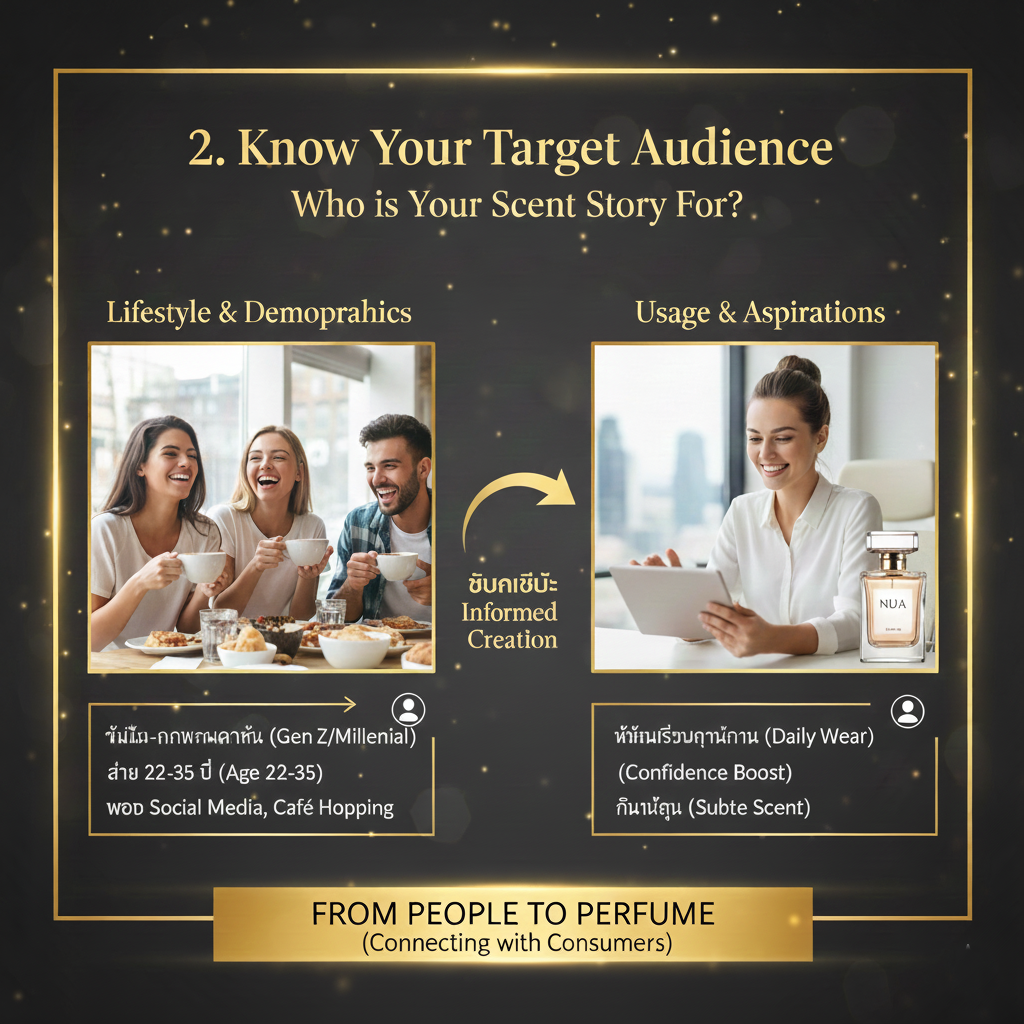 2. กลุ่มเป้าหมายชัดเจน (Target Audience)ใครคือคนที่จะยอมจ่ายเงินซื้อน้ำหอมของคุณ?- เพศ, อายุ, ไลฟ์สไตล์
