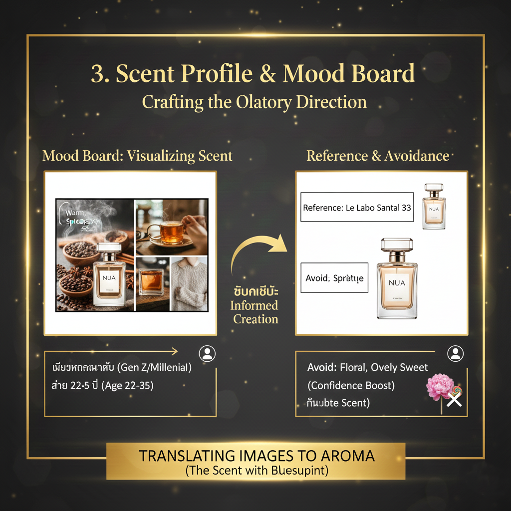3. แนวทางของกลิ่น (Scent Profile / Mood Board)ถ้ายังนึกชื่อโน้ตน้ำหอมไม่ออก ให้ใช้ "ภาพ" หรือ "ความรู้สึก" แทน:- Mood Board: รวบรวมรูปภาพโทนสีและบรรยากาศที่ต้องการ