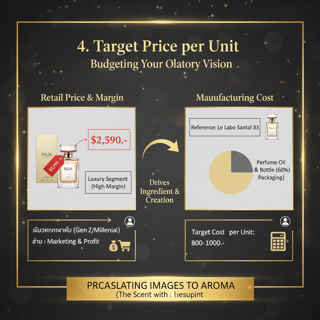 4. งบประมาณต่อขวด (Target Price per Unit)ข้อนี้สำคัญมากในการเลือก "เกรดน้ำหอม" และ "บรรจุภัณฑ์":- คุณอยากขายกี่บาท? (เช่น อยากขาย 390.- หรือ 2,590.-)