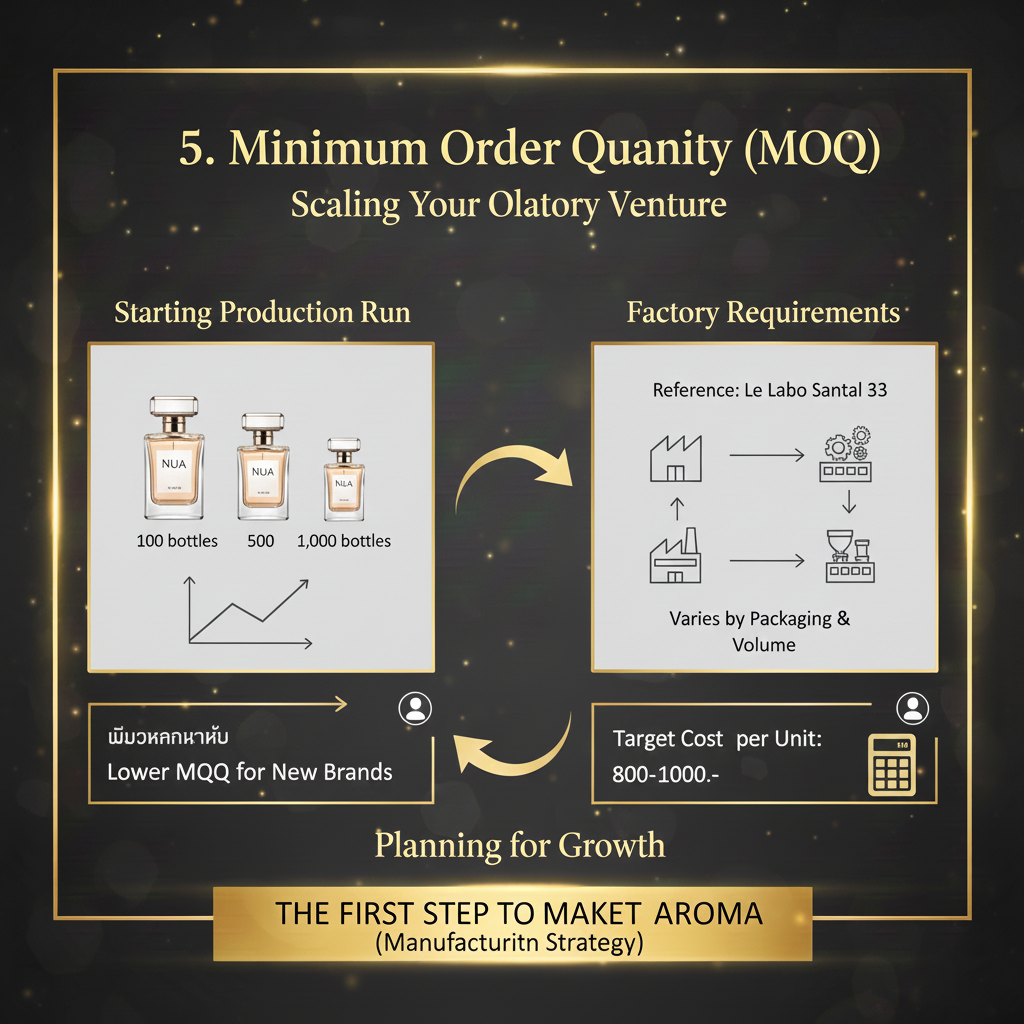 5. ปริมาณการผลิต (Minimum Order Quantity - MOQ)สอบถามและตัดสินใจเรื่องจำนวน:- ล็อตแรกอยากเริ่มที่กี่ขวด? (ส่วนใหญ่เริ่มต้นที่ 100, 500 หรือ 1,000 ขวด)