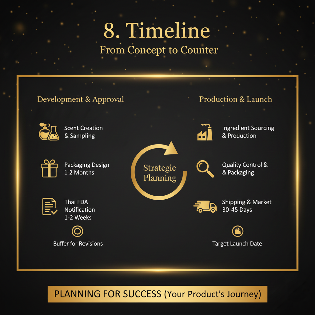 8. ไทม์ไลน์ (Timeline)คุณมีกำหนดการวางขายเมื่อไหร่?- เผื่อเวลาสำหรับการ: พัฒนากลิ่น (1-2 เดือน), ออกแบบบรรจุภัณฑ์, จดแจ้ง อย., และกระบวนการผลิต (30-45 วัน)