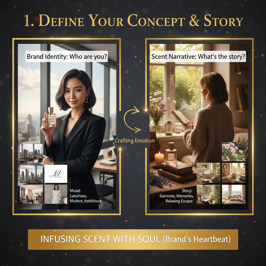 1. กำหนด "Concept & Story" (แนวคิดและเรื่องราว)โรงงานไม่ได้แค่ผสมน้ำหอม แต่เขากำลังปรุง "อารมณ์" คุณต้องบอกให้ชัดว่า:- แบรนด์ของคุณคือใคร? (หรูหรา, วัยรุ่นสดใส, มินิมอล)