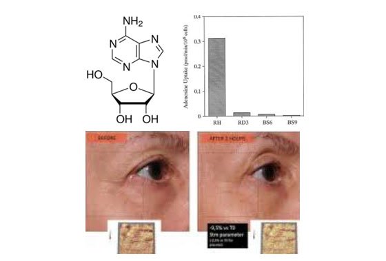 Adenosine เป็นส่วนสำคัญของการทำงานของ Cell ผิว เมื่ออายุมากขึ้น ปริมาณของ Adenosine ของผิวจะลดต่ำลง ทำให้ผิวเกิดริ้วรอย (aging) และชราลง การให้ Adenosine แก่ผิว เป็นเหมือนพลังงานให้ผิวสามารถซ่อมแซมตัวเองได้อย่างต่อเนื่องและมีประสิทธิภาพ [กรุณาดูรายละเอียดการวิจัยและทดลอง A.Role of Extracellular Adenosine Triphosphate in Human Skin B. Evaluation of anti-wrinkle efficacy of adenosine-containing products ]